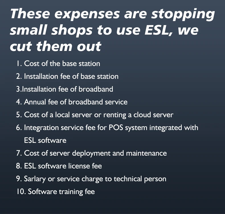Typically, implement Electronic Shelf Labels in a shop requires a lot of additional costs except the hardware cost of digital labels. Many initial expenses like server cost, installation cost, IT service costs are stopping small shops to use ESL.